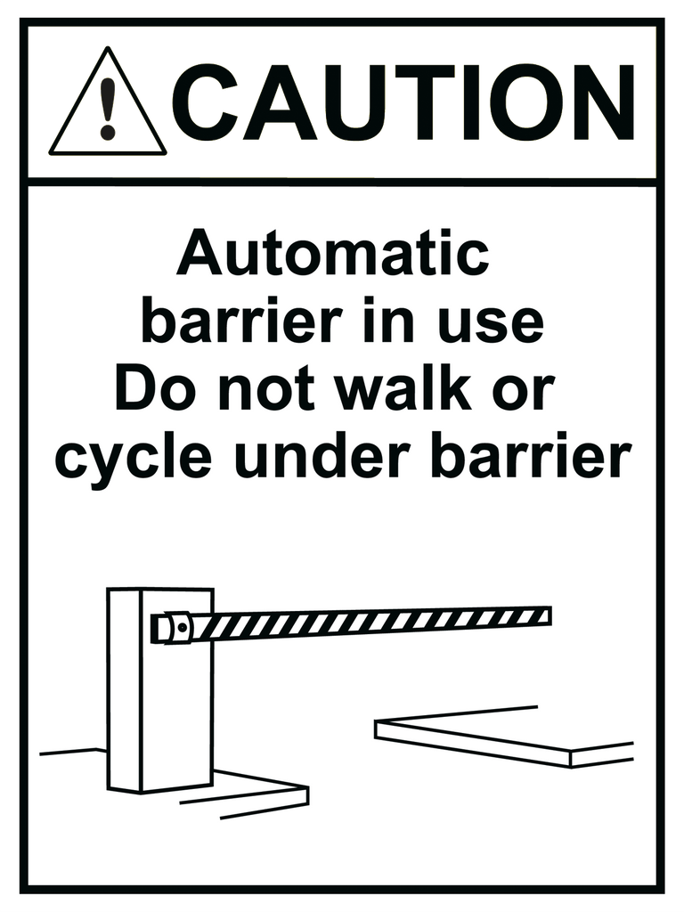 150 mm x 200 mm UV printed sign: "Caution Automatic barrier in use Do not walk or cycle under barrier" with customisable options